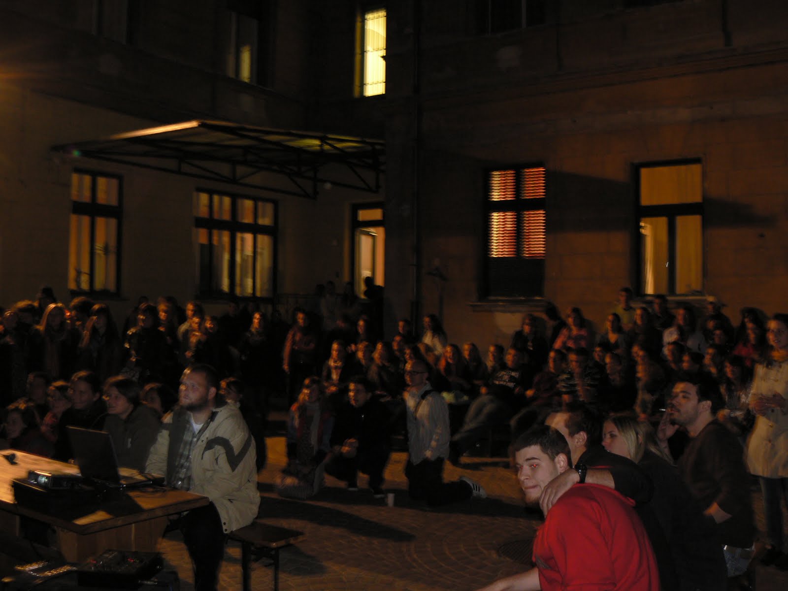 Így kerültem egyik csütörtök este a Reviczky utcába. Fél nyolckor találkoztam a többiekkel, majd csoportosan átvonultunk a Mélypont nevű sörözőbe. Nem terveztük hosszúra a Macifröccs iszogatását, hiszen aznap kilenc órától kezdődött életünk első Pincebulija. Miután beszámoltunk egymásnak az egyetemről szerzett tapasztalatainkról, közösen sétáltunk vissza az iskolához. Pozitívan csalódtam, mikor beléptem a belső udvarba: szemmel láthatólag minden újonc eljött, hogy megcsodálja a táborról készült videó-összeállítást. Hozzánk hasonlóan, mások is vidámabb állapotban kerültek oda az este, bár nem biztos, hogy a Macifröccstől. Az eufórikus hangulatot a csípős levegő, és a derengő fény is elősegítette. Nem kellett sokat várnunk a szabadban, mire a filmet elindították. Több mint öt percen keresztül a népes társaság egy irányba szegezte szemét, mosolyra nyitotta száját, és alkalomadtán magasba lendítette kezét. Volt egy pillanat, mikor többen egy tánc miatt keltek fel kényelmes helyükről. Ekkor szólalt meg az 'I need a hero' című szám. Pár percig csak álltam a kivetítő mellett, és kameralencsén át figyeltem a visszaemlékezést az arcokon. Boldog fiatal arcokat, akik örülnek, hogy egy ilyen közösségi programban vehettek részt.